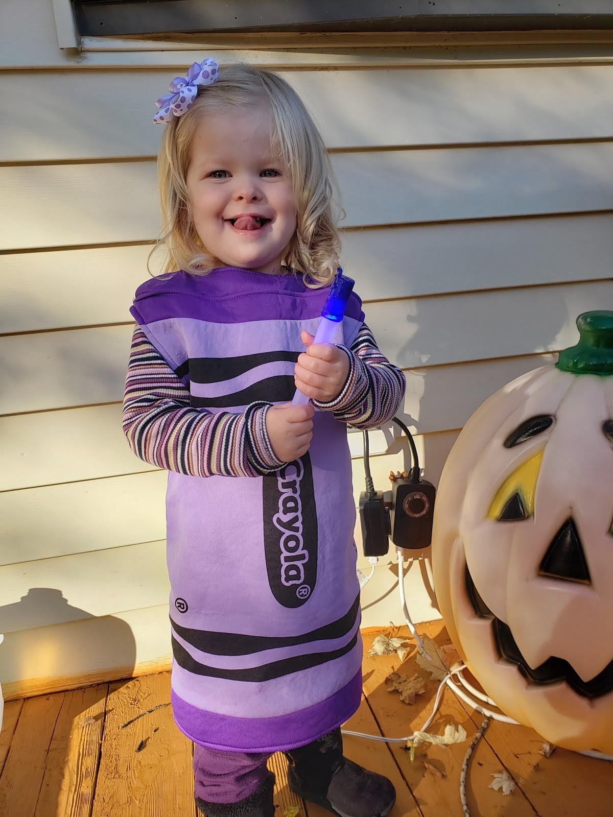 The week continued with two costume days at school and the library Halloween Party. She absolutely loved coming upstairs to the big kid rooms at school to trick or treat. She marched right up with her bag and said Trick Or Treat! when she got to my classroom. She talked about the other kids' costumes and was just thrilled with all the excitement. She did end up having her first sucker since they were allowed to have one in her classroom after trick or treating. She then of course wanted more once she got home and just ripped wrappers off and licked away!